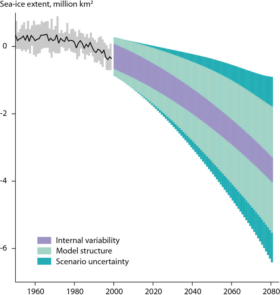 Figure 5.5 Uncertainty range for future sea-ice extent projections due to internal variability, model structure, and scenario uncertainty. Estimated from CMIP3 models based on the method of Hawkins and Sutton (2009) (Lique et al., 2016).