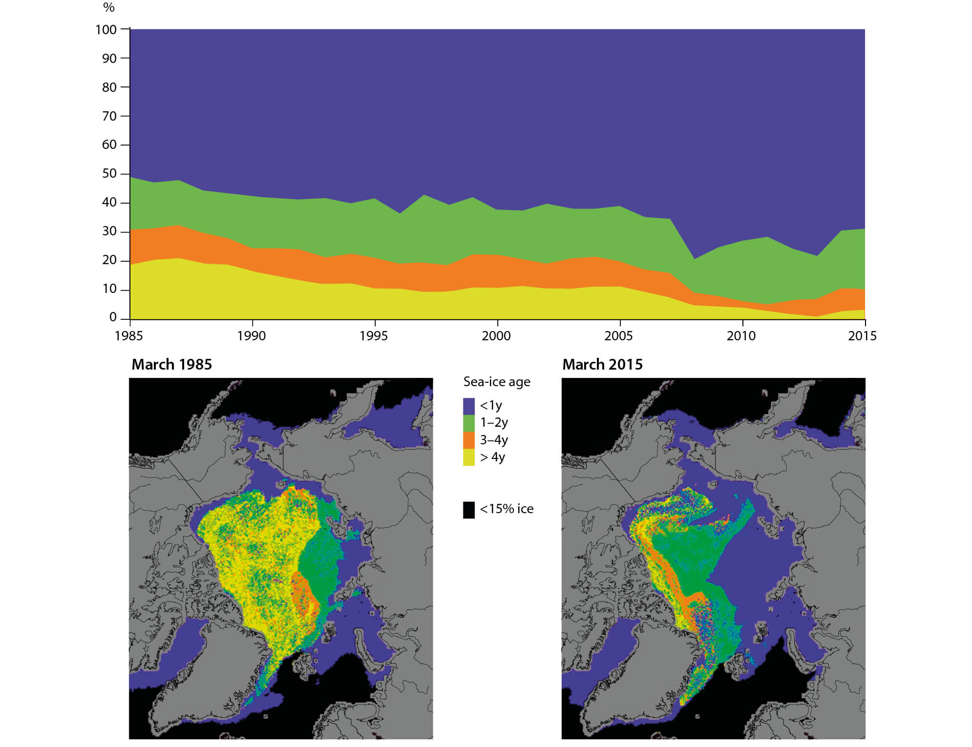 Figure 5.8 A time series of sea-ice age in March from 1985 to the present and maps of sea ice age in March 1985 and March 2015 (Perovich et al., 2015).