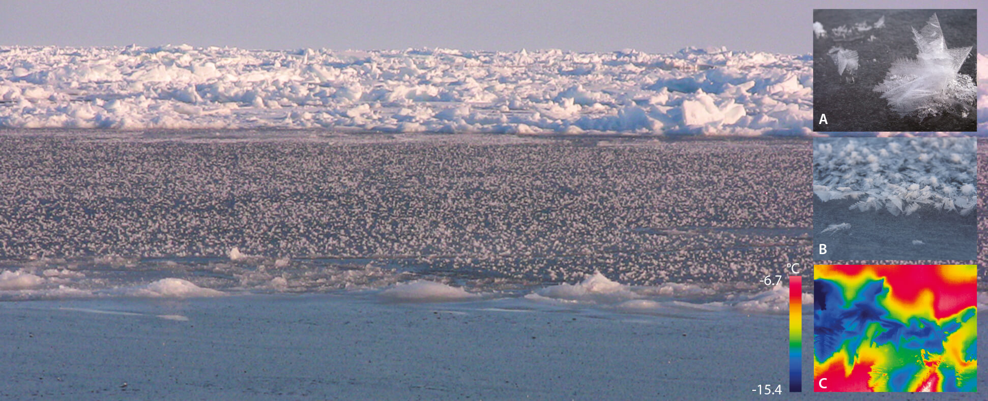 Figure 5.13 Frost flowers on sea ice showing a refrozen lead with new flowers; (A) an individual flower, (B) a collection of frost flowers and (C) a thermal infra-red image of a single flower (based on Barber et al., 2014b).