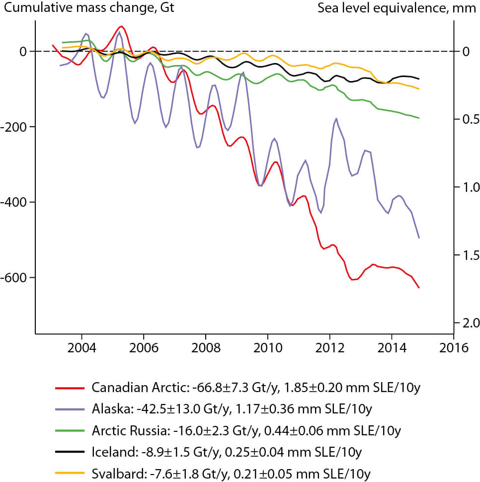 Figure 6.1 Arctic glacier cumulative total mass change and sea level equivalence (SLE) (Wouters et al., 2008; updated by B. Wouters, Utrecht University). Uncertainty ranges represent the standard deviation of least squares fits plus uncertainties in the corrections for glacial isostatic adjustment.