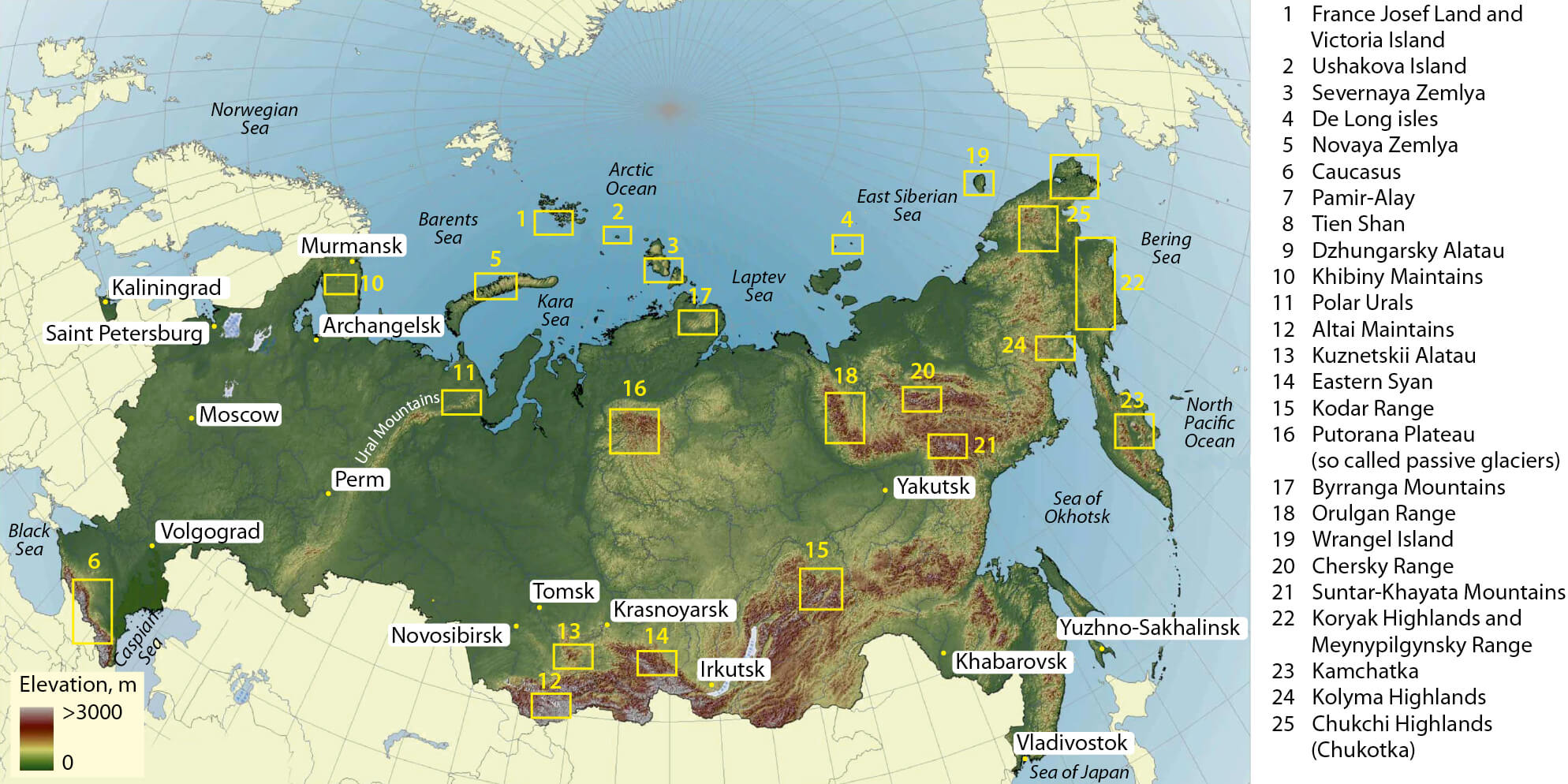 Figure 6.6 Siberian glacier locations (Maria Ananicheva). Glaciers 7, 8 and 9 not shown.
