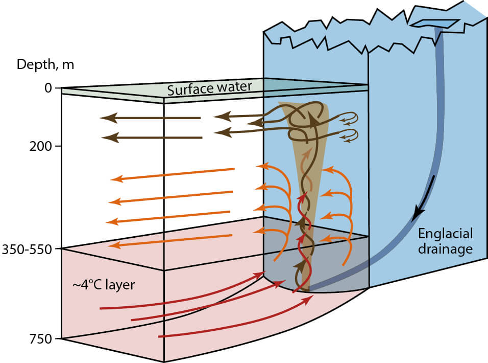 Figure 6.7 Englacial and subglacial meltwater emerges at tidewater glacier fronts, forcing a heat exchange between the ice front and relatively warm ocean waters. In cases where water depth exceeds 350 m, entrainment of water of 4–5°C can enhance melt rates (after Chauché et al., 2014).