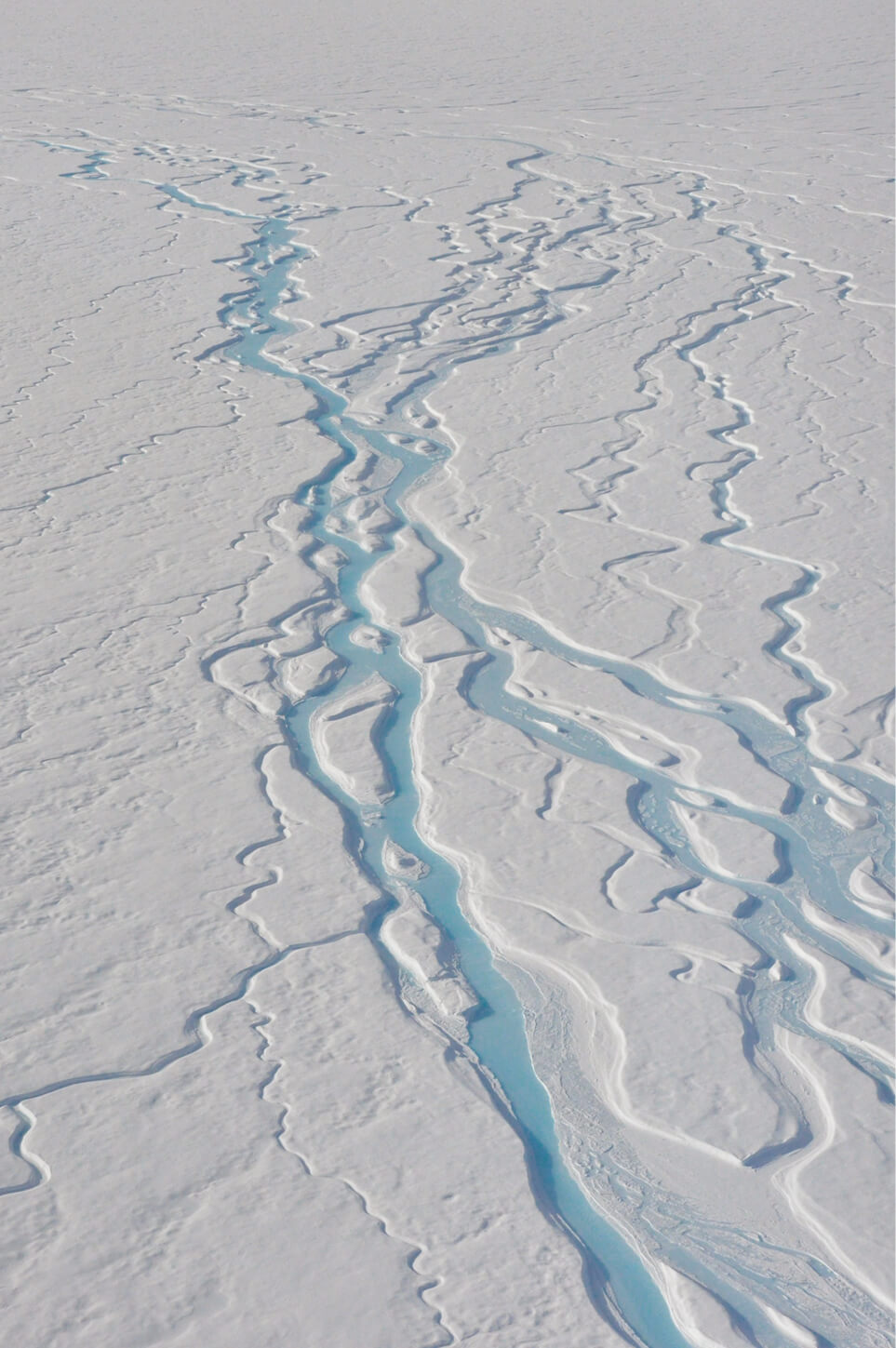 Figure 6.9 Aerial oblique view on 12 August 2012 of meltwater channeling in the surface snow and firn of the southwestern Greenland ice sheet lower accumulation area at 1800 m elevation, made possible by the development of thick impermeable ice layers in successive previous high melt years.