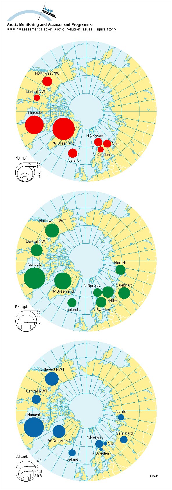 Geometric mean concentrations of mercury, lead and cadmium in maternal whole blood; AMAP circumpolar study 1994-95, see Table 12A13
