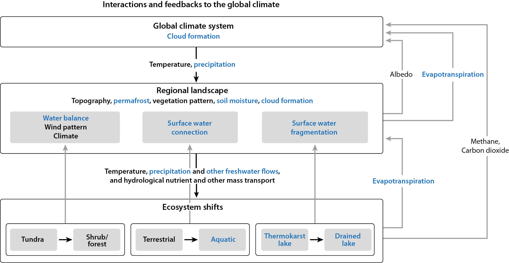 Figure 7.11 Interactions and feedbacks from three general types of ecosystem shift in Arctic terrestrial and freshwater environments: tundra to shrub/forest, terrestrial to aquatic, and thermokarst lakes to drained lakes (Wrona et al., 2016 – adapted from Karlsson et al., 2011).
