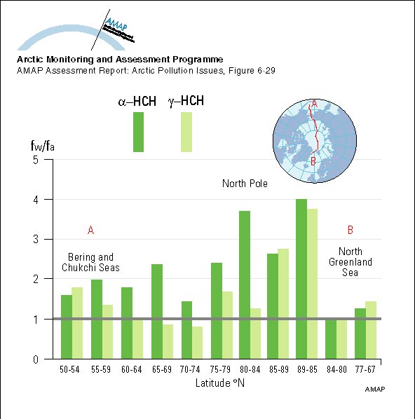 Water/air fugacity ratios (fw/fa) of alpha-HCH and gamma-HCH on a transect from the Bering Sea to the Greenland Sea in July and August 1994 A fugacity ratio of 1 indicates air-water equilibrium