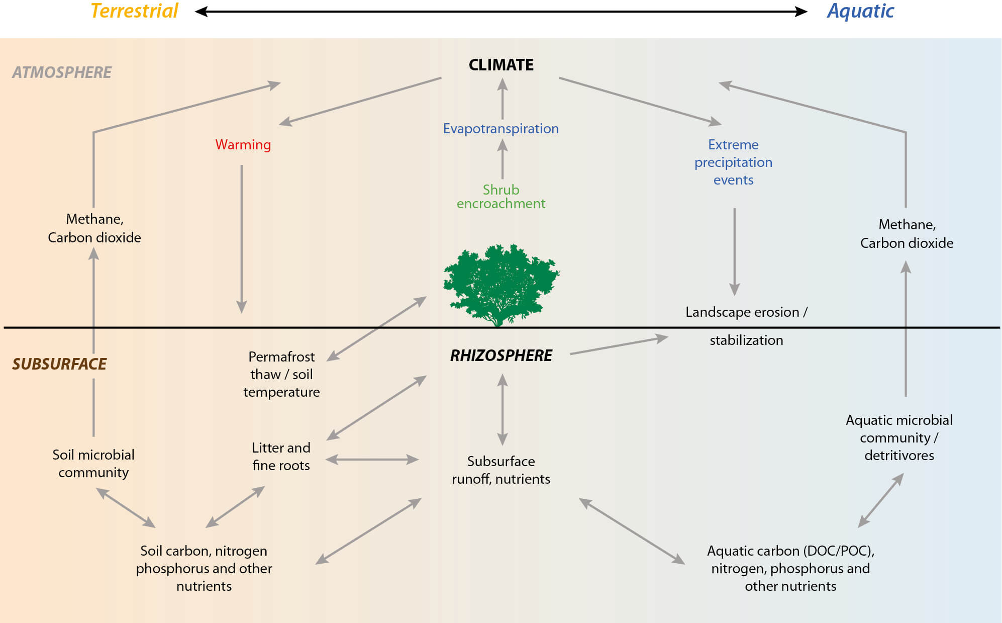 Figure 7.12 Linkages and possible effects of vegetation change on Arctic terrestrial and aquatic biogeochemical and ecological processes (Wrona et al., 2016 – adapted from Myers-Smith et al., 2011).