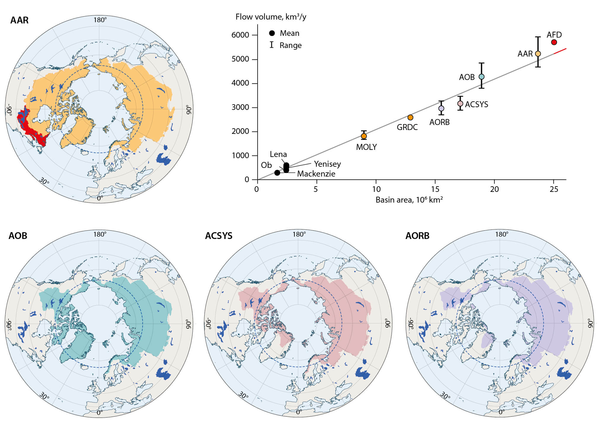 Figure 7.16 Based on Figure 7.3, the newly defined Arctic Freshwater Domain (AFD) is shown with the Laurentian Great Lakes / St Lawrence River system noted in Figure 7.15 (here outlined in red) added to the All Arctic Regions (AAR) definition shown in yellow (after Prowse and Flegg, 2000a); plus an update of the flow volume by contributing area relationship (after Prowse and Flegg, 2000b), which includes in the upper right, the largest area and flow volume TCA - the newly defined AFD (Prowse et al., 2015b).