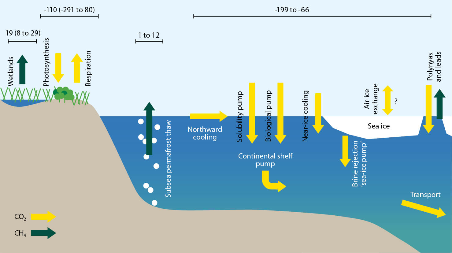 Figure 8.1 Simplified representation of those Arctic carbon fluxes that may be influenced by sea-ice retreat (Parmentier et al., 2013). Current best estimates of sink/source strengths are shown in TgC/y, where available. The uncertainty ranges of the terrestrial fluxes are shown in brackets. The arrows do not indicate the strength of each flux.