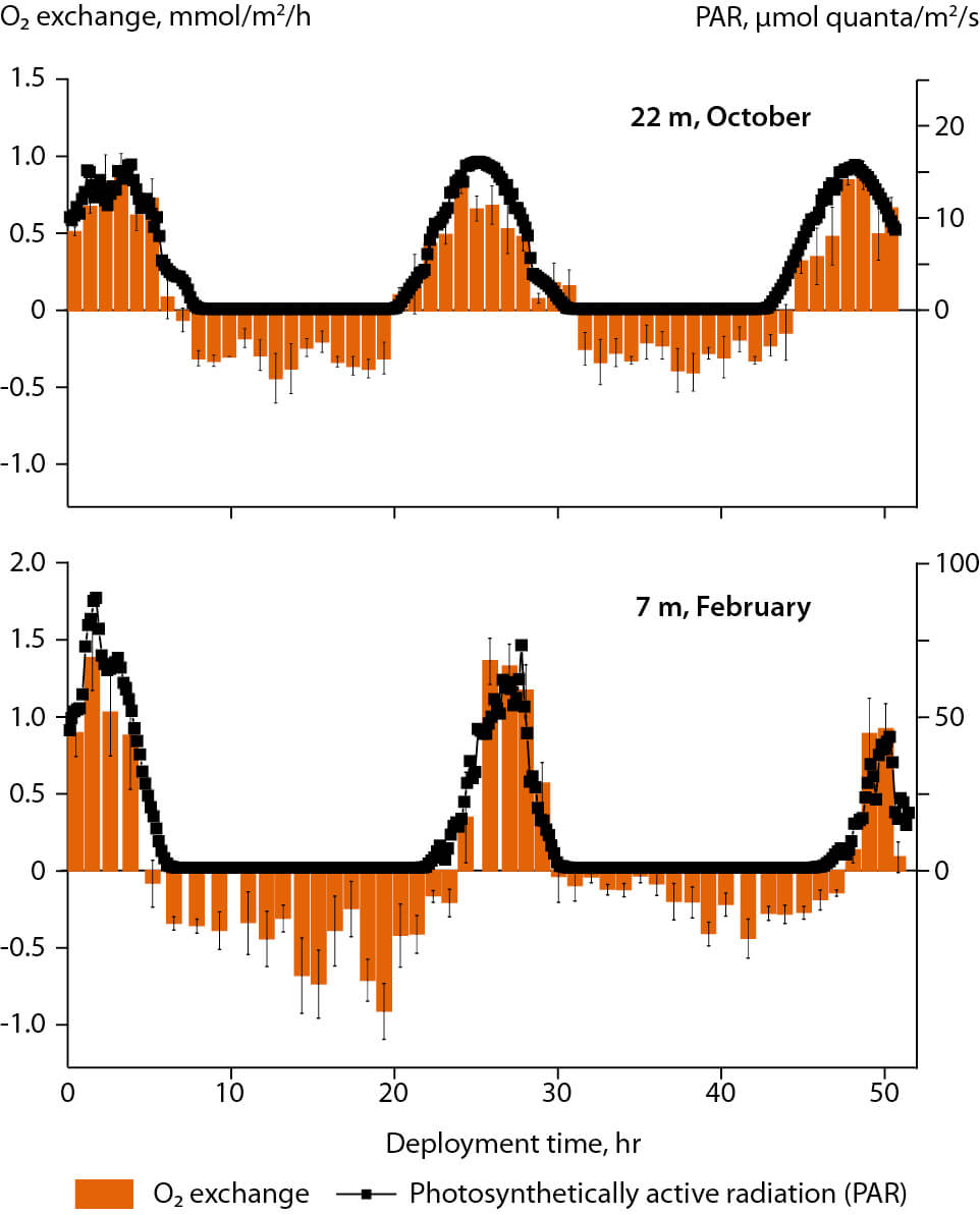 Figure 8.2 Net oxygen (O2) production by benthic diatoms in Nuuk fjord (Greenland) in daytime at 22 m water depth in October and 7 m water depth in February. The light level required to induce net O2 production was between 2 and 4 μmol quanta/m2/s (Attard et al., 2014).