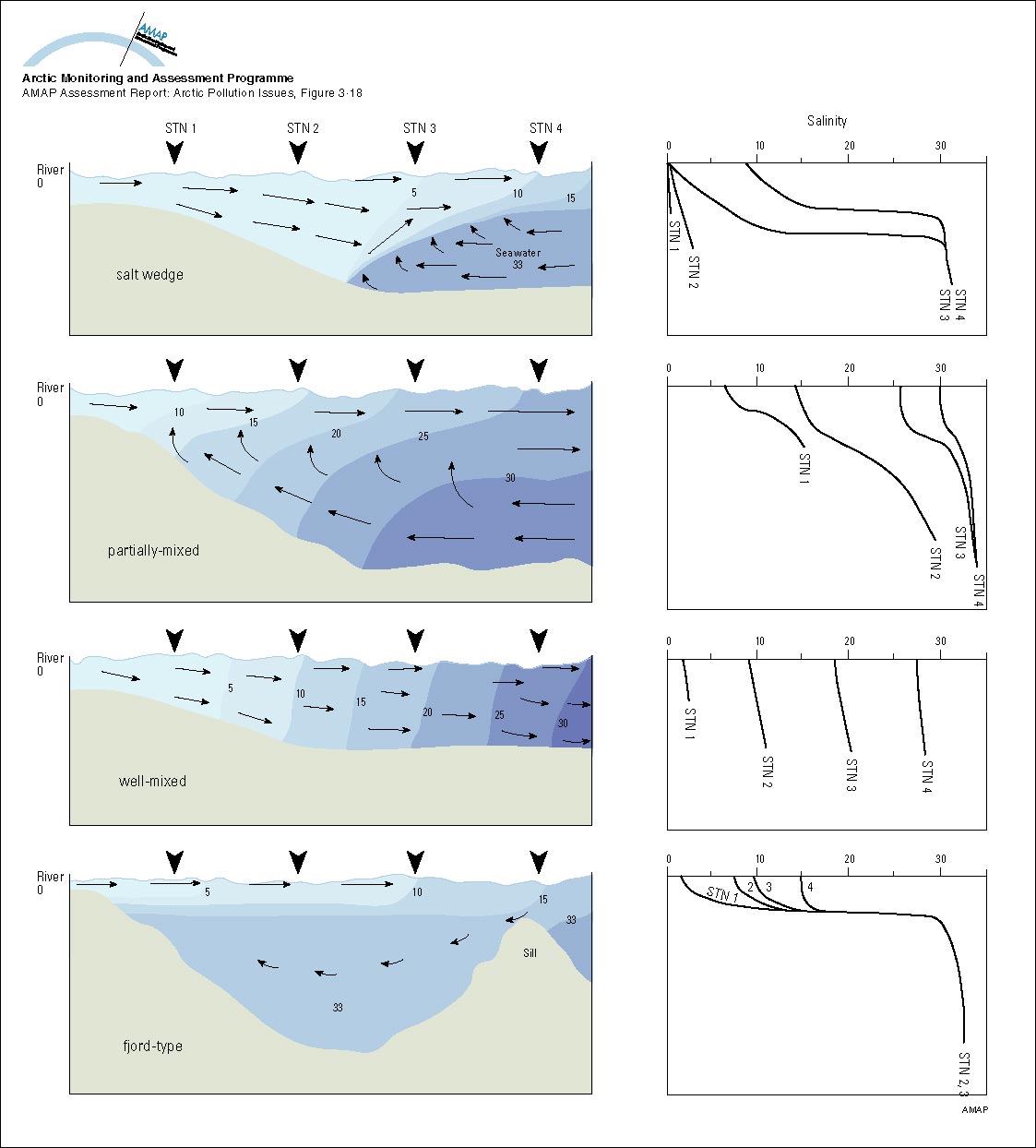Basic circulation and salinity distribution in salt wedge, partially-mixed, well-mixed and fjord-type estuaries as defined by Wollast and Duinker (1982) Numbers and shading show salinity values