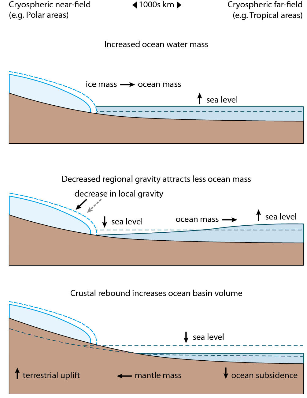 Figure 9.1 Schematic overview of cryospheric processes that influence absolute and relative sea level.