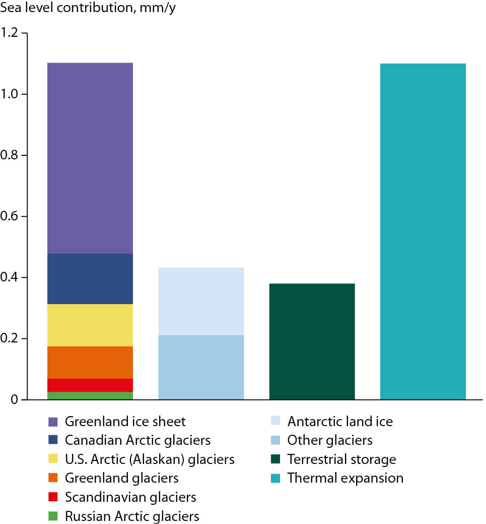 Figure 9.3 Comparison of Arctic sea level rates 2004–2010 with other global sea level components. ‘Scandinavian glaciers’ includes both Iceland and Svalbard. ‘Other glaciers’ includes, for example, Patagonian, Himalayan, African, and Indonesian land ice sources.