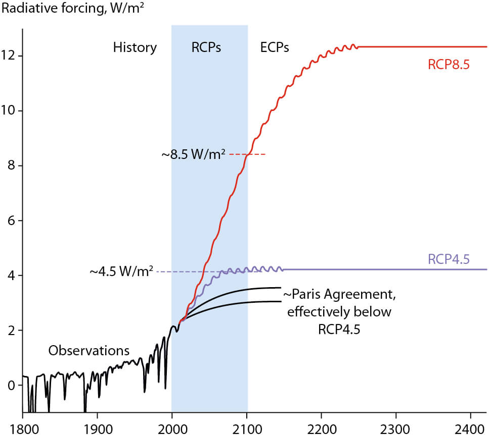 Figure 9.5 Representative Concentration Pathway (RCP) scenarios RCP4.5 and RCP8.5 including Extended Concentration Pathways (ECPs) after Meinshausen et al. (2011). The graphic indicates an approximate trajectory for the Paris Agreement. RCP8.5 is conceptualized as relatively slow adoption of low-carbon energy systems and weak international cooperation in reducing carbon emissions. RCP4.5, by contrast, is conceptualized as rapid development and implementation of low-carbon technology under strong international cooperation.
