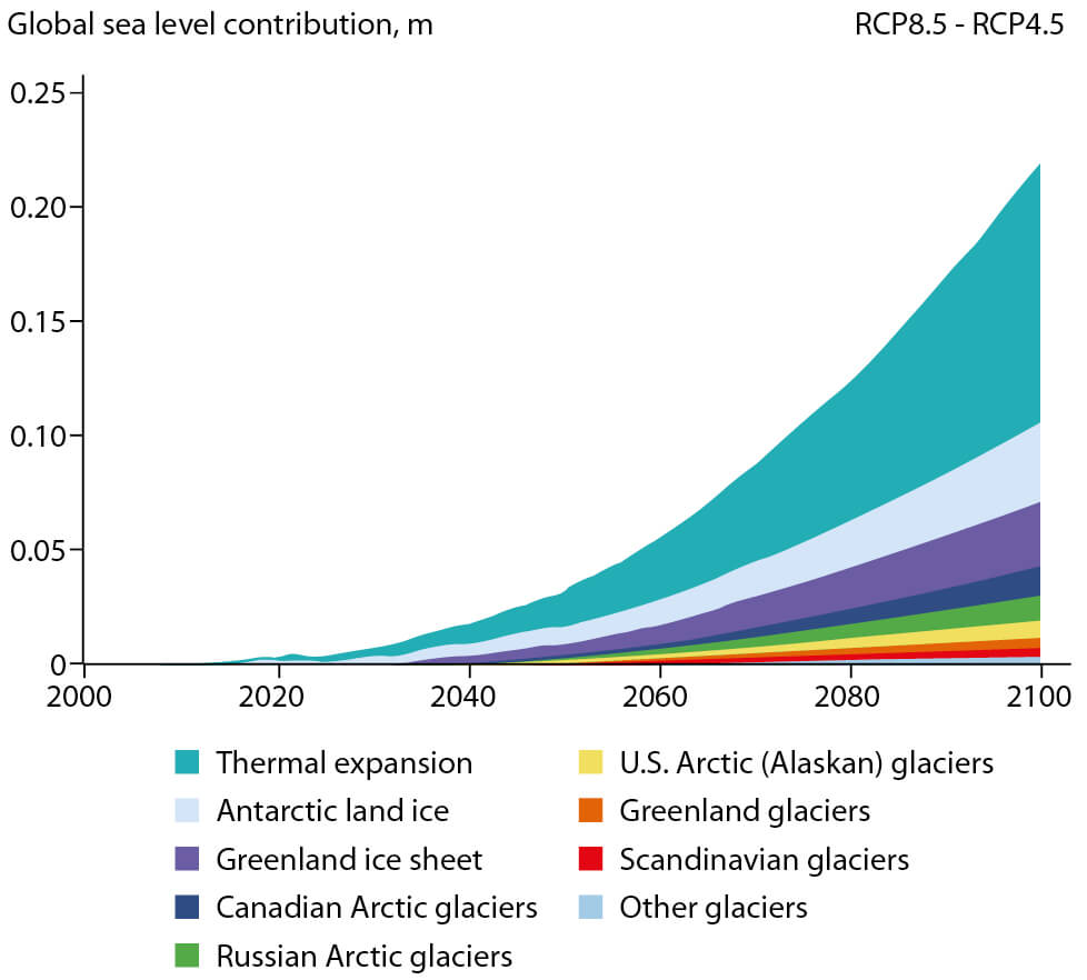 Figure 9.8 Sea level component summed difference: RCP8.5 minus RCP4.5. ‘Scandinavian glaciers’ includes both Iceland and Svalbard. ‘Other glaciers’ includes, for example, Patagonian, Himalayan, African, and Indonesian land ice sources.