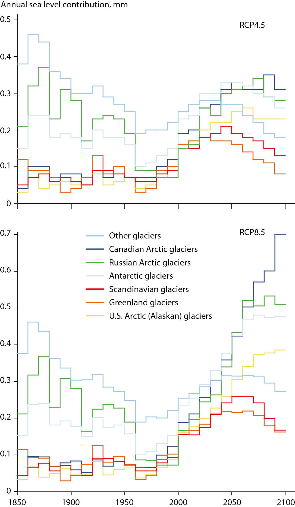 Figure 9.9 Annual sea level contribution, averaged per decade between 1850–2100, from the Arctic land ice and other regions simulated by Marzeion et al. (2012) under RCP4.5 and RCP8.5.