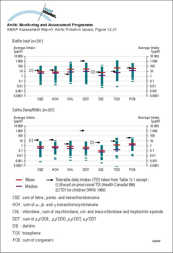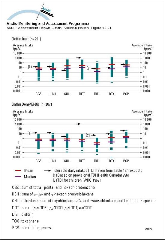 adapted from: Kuhnlein, H.V., O. Receveur, D. Muir, H.M. Chan and R. Soueida, 1995. Arctic indigenous women consume greater than acceptable levels of organochlorines. J. Nutr. 125: 2501-2510 (AAR Figure 12.21)