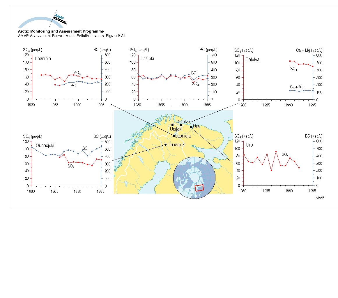 data sources: Ounasjoki, Utsjoki and Laanioja - Finnish Environment Institute, unpubl.; Dalelva - Traaen pers. comm.; Ura - Moiseenko pers. comm. (AAR Figure 9.24)