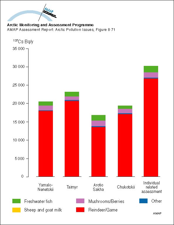 Estimated source of dietary intake of 137Cs by various indigenous population groups in different regions of Arctic Russia in 1993, and the AMAP region as a whole
