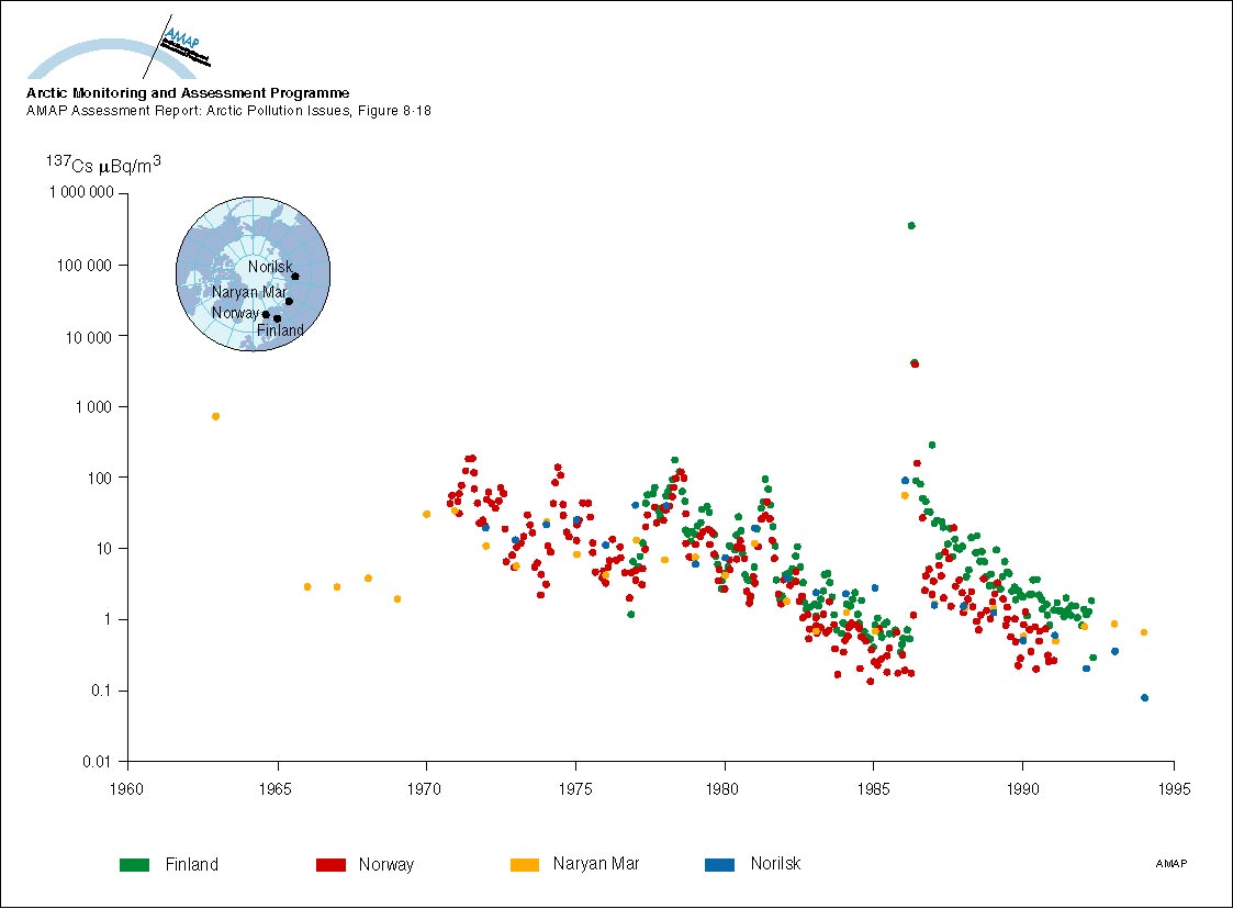 Changes with time in 137Cs activity concentration in air in Norway, Finland and Russia