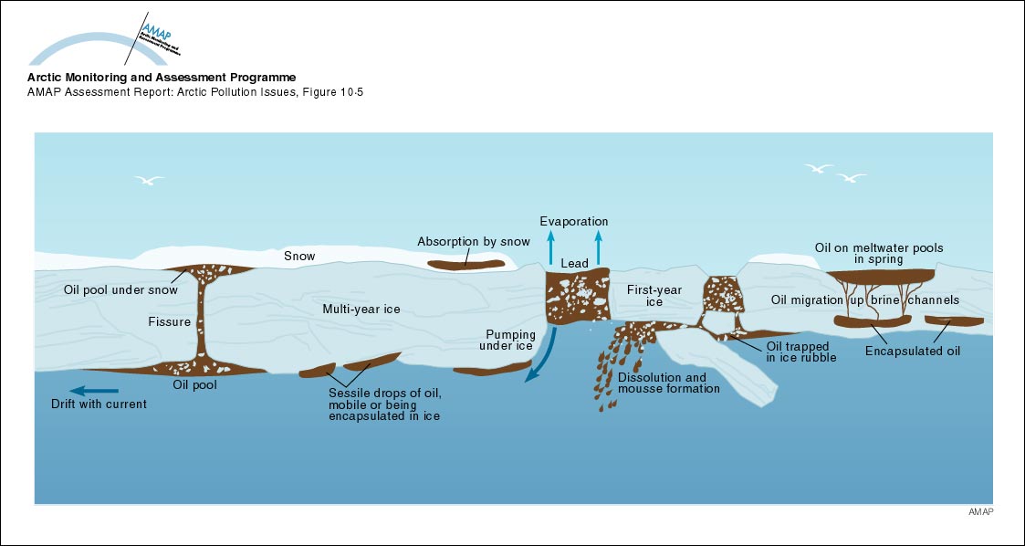 Sequence of oil-ice interaction including drops under the ice, new ice growth below the oil, oil appearing on the surface in the spring, wind herding of oil on melt pools, and the appearance of emulsified oil on top of the ice
