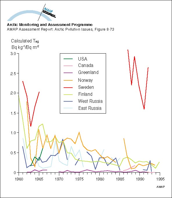 Temporal variation in calculated reindeer Tag values for different Arctic regions