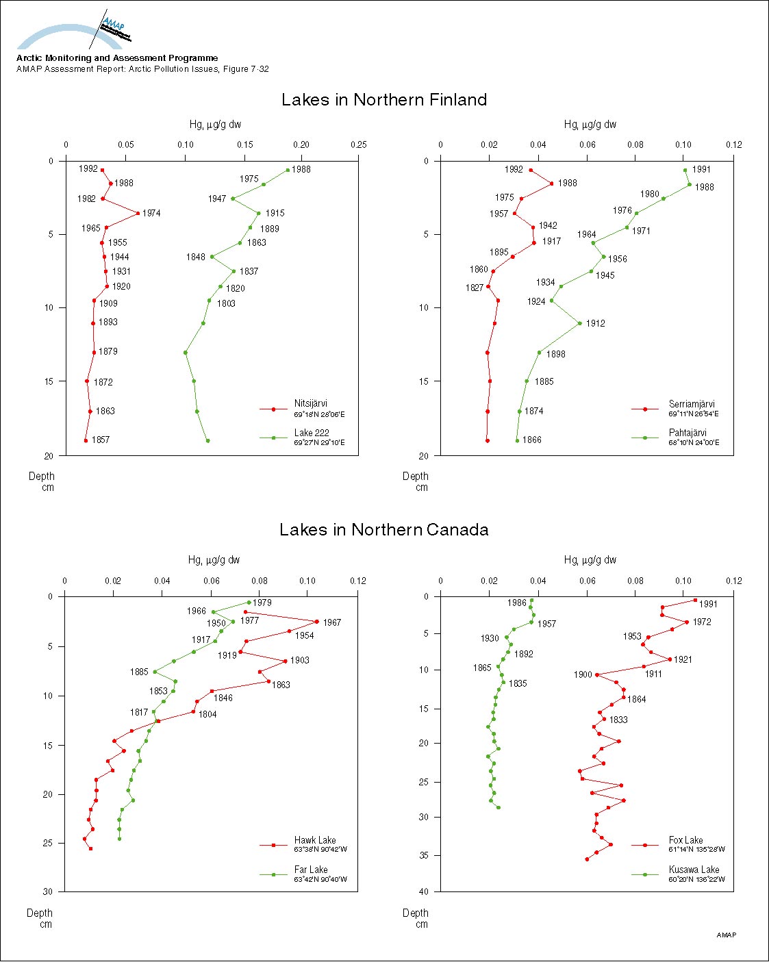 Concentrations of Hg in dated sediment cores from lakes in Arctic Finland and Canada