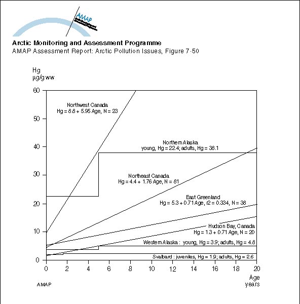 Age accumulation of Hg in liver of polar bears from different Arctic regions