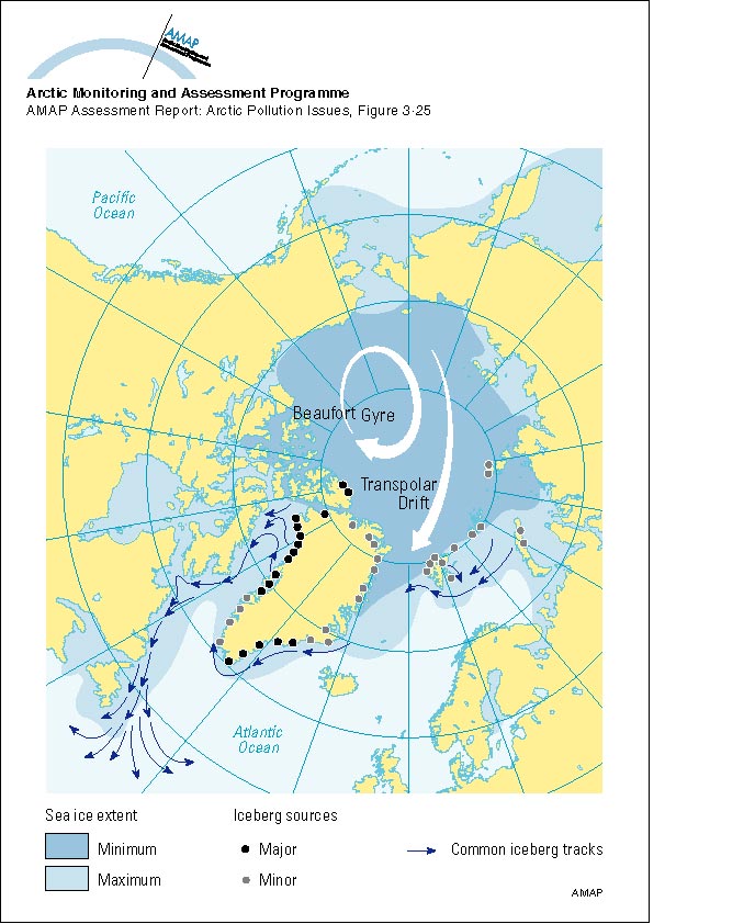 Main sources of icebergs and common iceberg drift trajectories The main ice circulation pattern follows the Transpolar Drift in the eastern Arctic and the Beaufort Gyre in the western Arctic (white arrows)