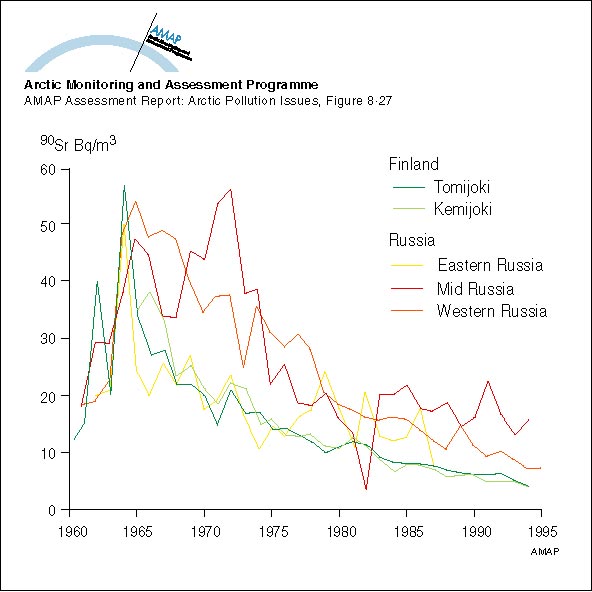 Changes with time in activity concentration of 90Sr in Russian and Finnish rivers