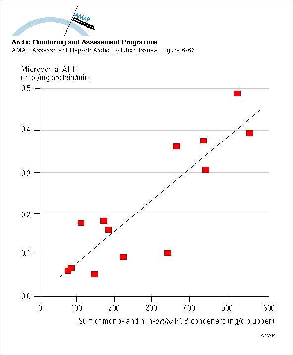 Aryl hydrocarbon hydroxylase (AHH, nmol/mg microsomal protein/min) activities in liver microsomes of beluga taken from the Eskimo Lakes area of the Mackenzie Delta, as a function of PCB congener concentrations in blubber