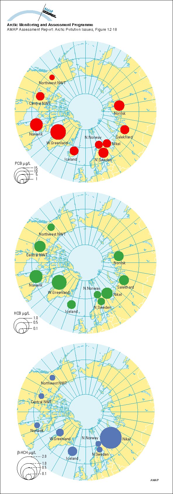 Geometric mean concentrations of PCB, HCB and B-HCH in maternal blood plasma; AMAP circumpolar study 1995, see Table 12A12