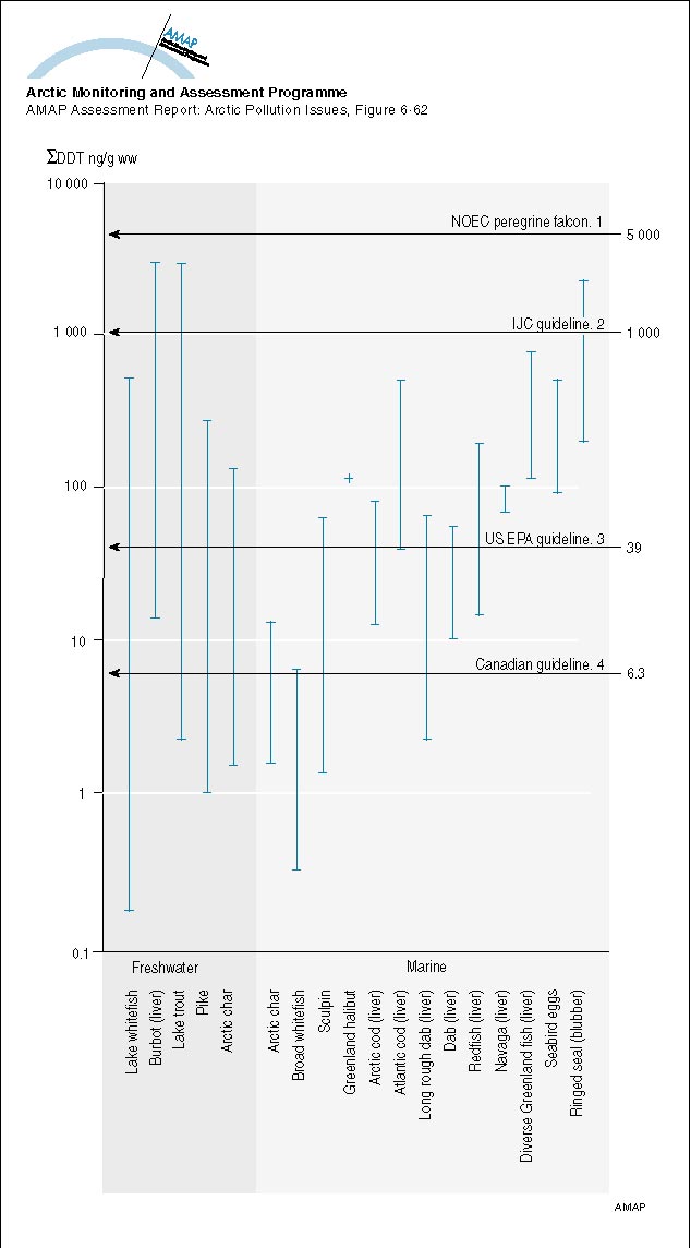 Sum-DDT (ng/g ww) in Arctic animals as food items compared to no-effect-concentrations (NOAEC) and environmental quality guidelines for protecting fish-eating/aquatic wildlife (1 Baril et al 1990, 2 USEPA 1995,