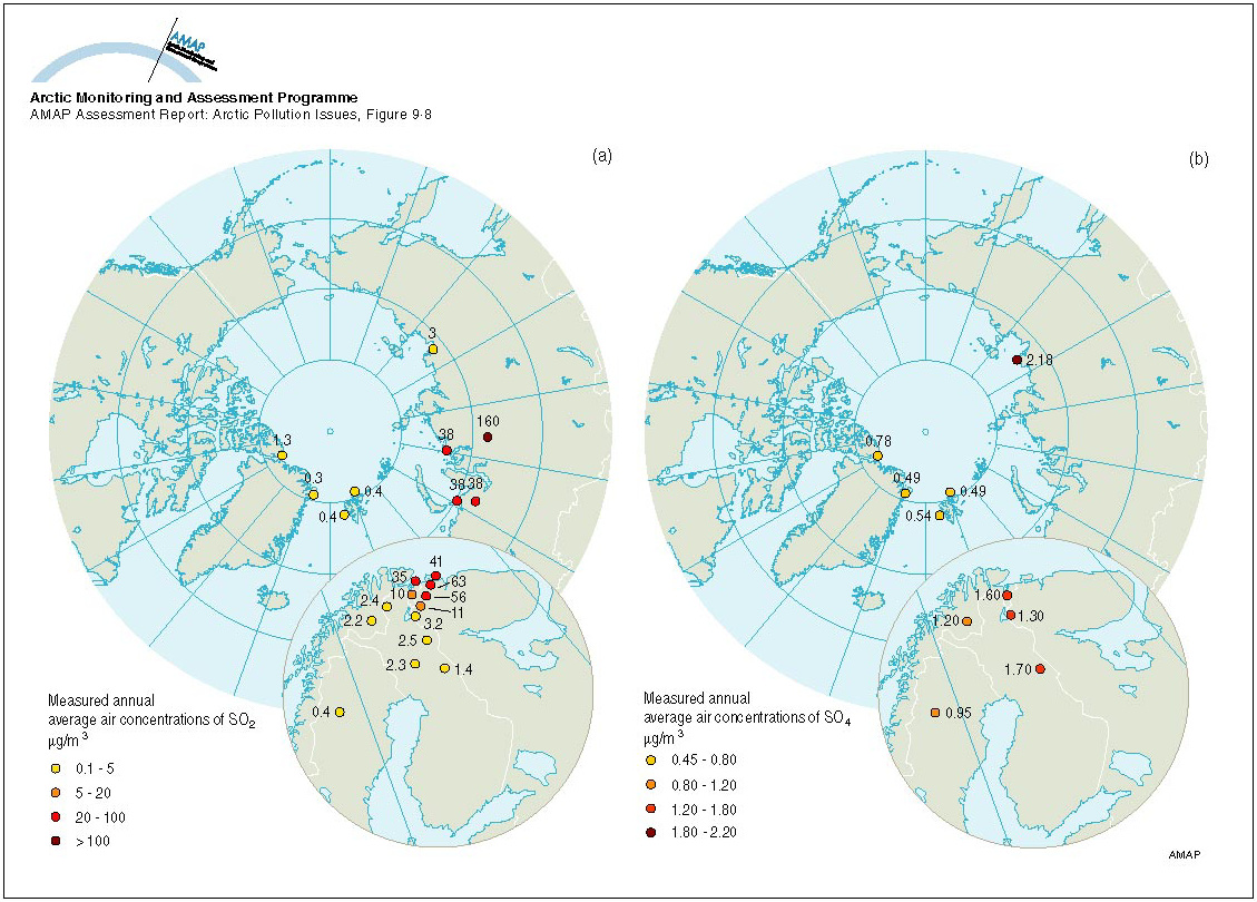 (a) Yearly average sulfur dioxide air concentration measurements in the Arctic, (b) Yearly average sulfate air concentration measurements in the Arctic