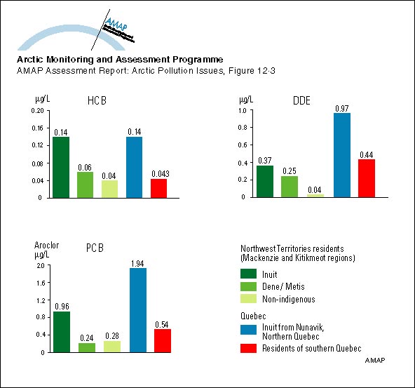 Geometric mean levels of HCB, DDE and PCBs in cord blood of newborns in different Canadian population groups