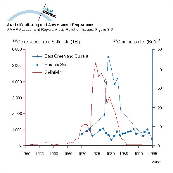 Seawater concentrations of 137Cs in the Barents and East Greenland Seas compared to the yearly releases from Sellafield
