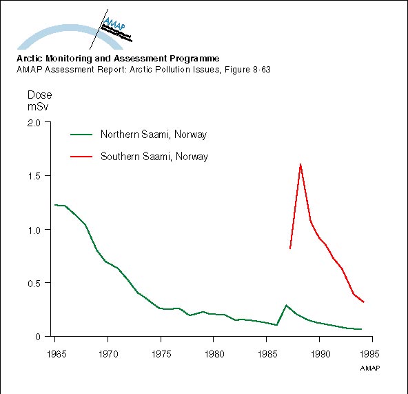 Dose estimates based on wholebody measurements (see Figure 836) for two groups (northern Saami and southern Saami) of Norwegian reindeer-breeding Saami