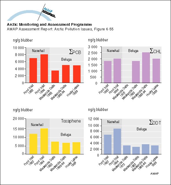 data for beluga from 1972: Addison, R.F. and P.F. Brodie, 1973. Occurrence of DDT residues in beluga whales (Delphinapterus leucas) from the Mackenzie Delta, N.W.T. J. Fish. Res. Bd Can. 30: 1733-1736. data for narwhal: Muir, D.C.G., 1994. Spati
