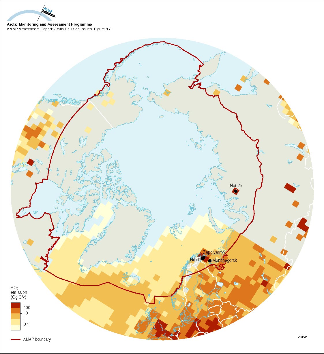 SO2 emissions north of 50°N (modified after Benkovitz et al 1995, see Figure 91) showing point source emissions from Arctic and subarctic non-ferrous smelters and including natural DMS sources from the North Atlantic Ocean Area sources are not included