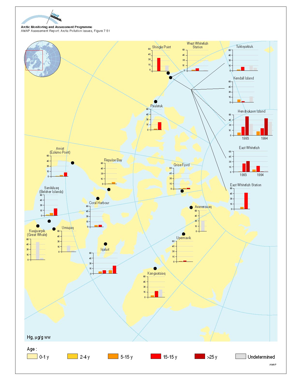 Distribution of Hg levels in liver tissue of beluga whale (Delphinapterus leucas) of different ages (years) Plots show selected data (geometric mean values) from Annex Table 7A15