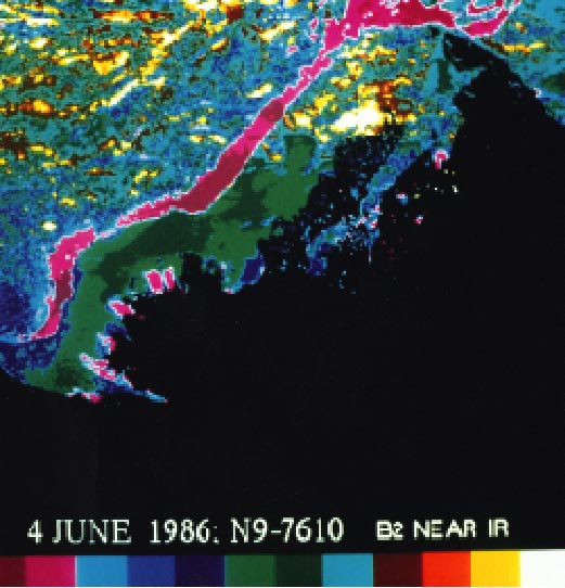 Advanced Very High Resolution Radiometer (AVHRR) satellite image (June 4, 1986) showing a color composite of the visible data band for the Mackenzie Delta River water overflowing the landfast ice can be seen as purple regions