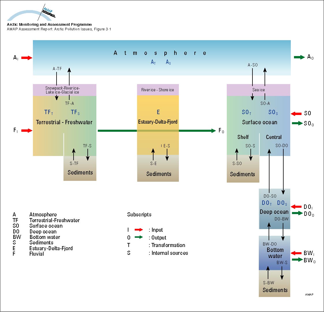 A multi-compartment schematic diagram of the major pathways of contaminants into and within the Arctic environment