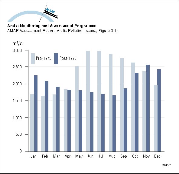 Monthly mean discharges for the Nelson River, Canada for the period 1960 to regulation in 1973, compared to post-regulation discharges from 1976 to 1990