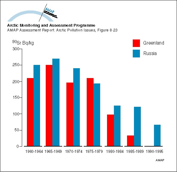 Changes with time in 90Sr activity concentration (5-year means) in lichens in Greenland and Russia
