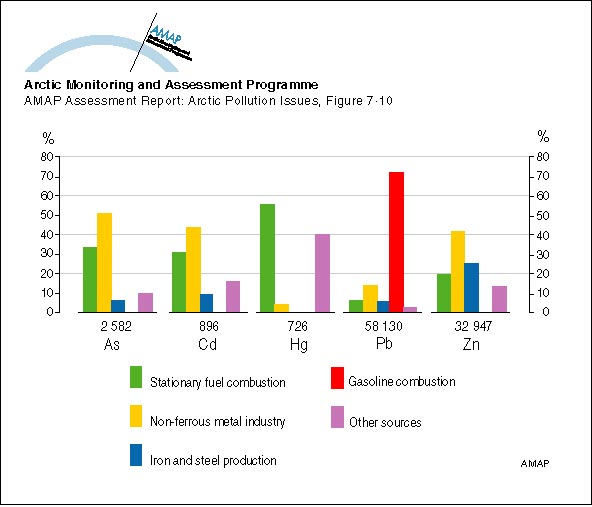 Emissions of selected heavy metals to the atmosphere in Europe at the beginning of the 1990s Numbers under the columns are emissions in tonnes per year