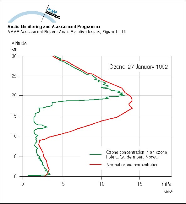 Ozone soundings at Gardermoen, southern Norway, 27 January 1992 The green line denotes the partial pressure of ozone observed during the (type 1) anomaly, when low-ozone air passed over the area