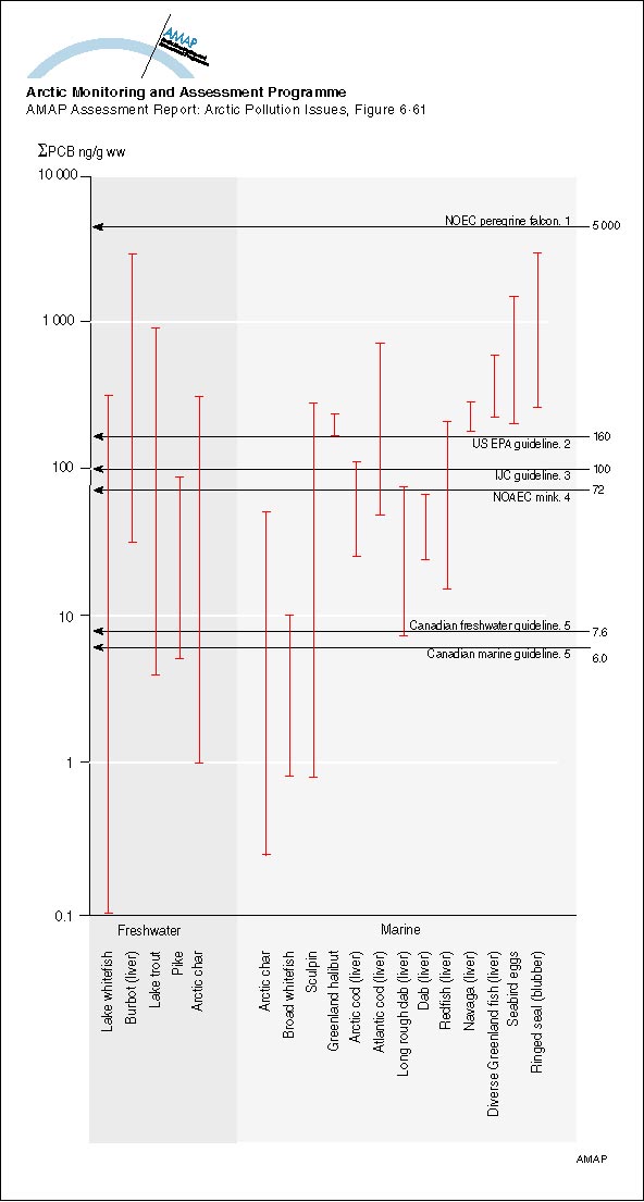 Sum-PCB (ng/g ww) in Arctic animals as food items compared to no-effect-concentrations (NOAEC) and environmental quality guidelines for protecting fish-eating/aquatic wildlife (1 Baril et al 1990, 2 USEPA 1995,