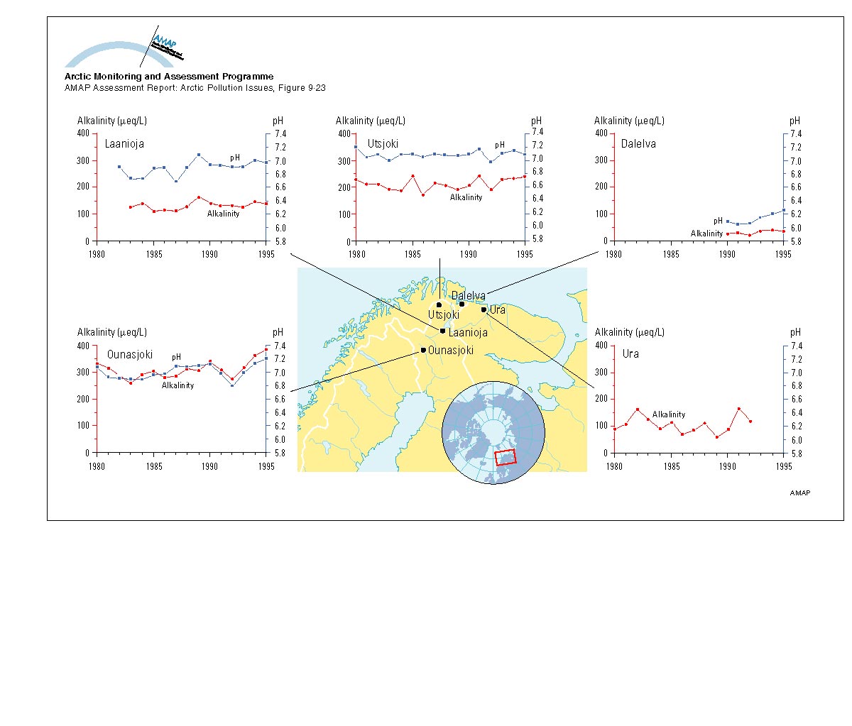 data sources: Ounasjoki, Utsjoki and Laanioja - Finnish Environment Institute, unpubl.; Dalelva - Traaen pers. comm.; Ura - Moiseenko pers. Comm (AAR Figure 9.23)