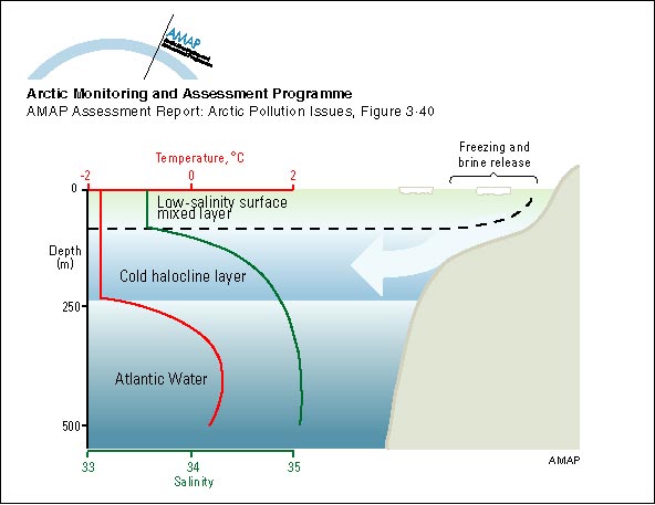 Schematic representation of the temperature and salinity structure of the upper Arctic Ocean and how the halocline layer is maintained by brine-rich water produced on the shelves
