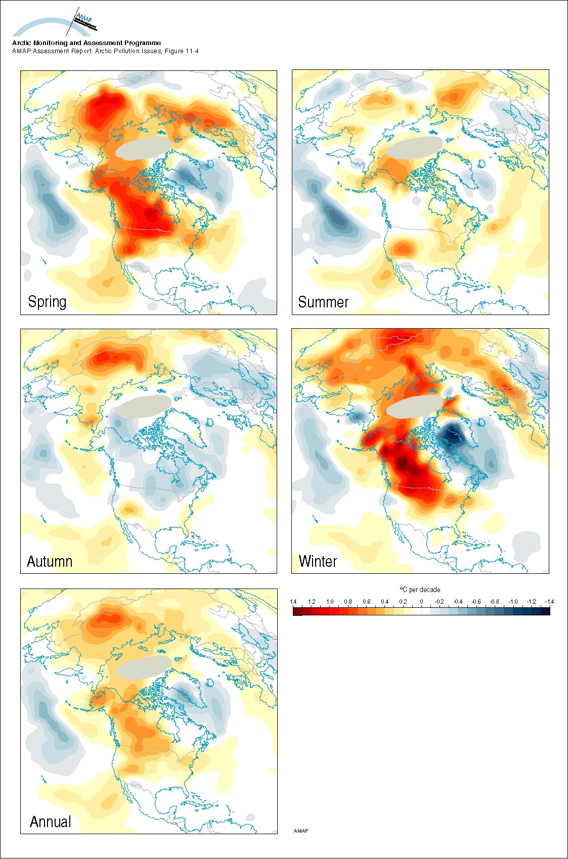 Seasonal and annual average surface temperature trends (°C per decade) over the northern hemisphere